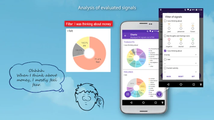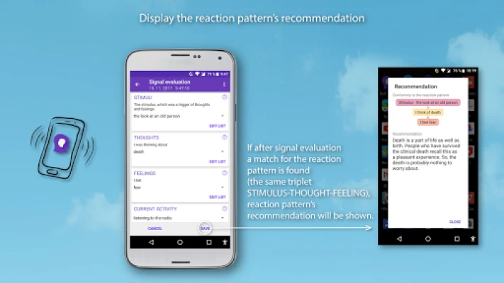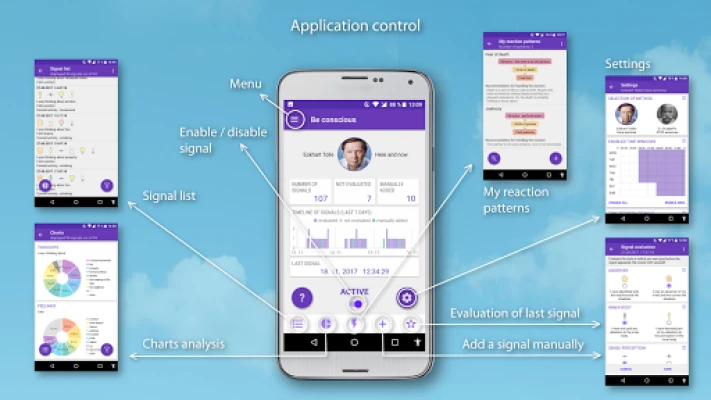 The mind is always trying to drag us into solving fictional situations in the future or experiences from the past. The signals generated by the app and the need of their consecutive evaluation make the person return from their constructions of thoughts to the present moment and live their life as consciously and in the present as possible.
