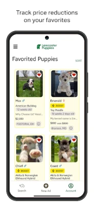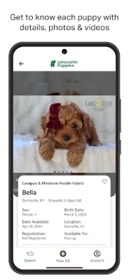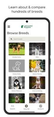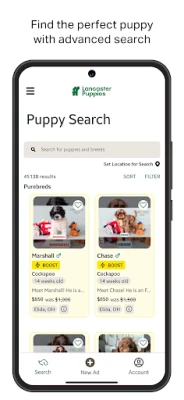 Looking for a new furry family member? Browse the largest marketplace of puppies from sellers across the Northeast and Midwest on the Lancaster Puppies App. This all-in-one app pairs reputable breeders and healthy puppies with future dog owners. Learn about breeds by browsing our breed guides and comparing breed groups across purebred, designer and hybrid puppies. Find your puppy by filtering by breed, size, color, sex, age, location, category, registration, pedigree, and price.